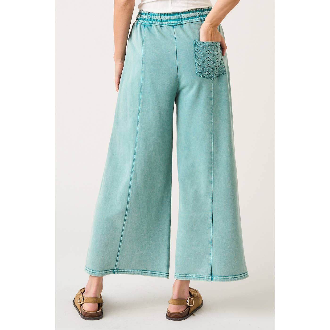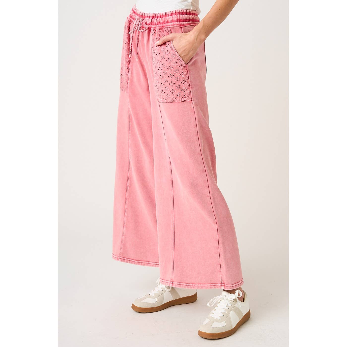 # spring, summer, pants, bottoms, sweatpants, loungewear, lounge pants, mineral washed, pocket, lace, crochet, boho, bohemian