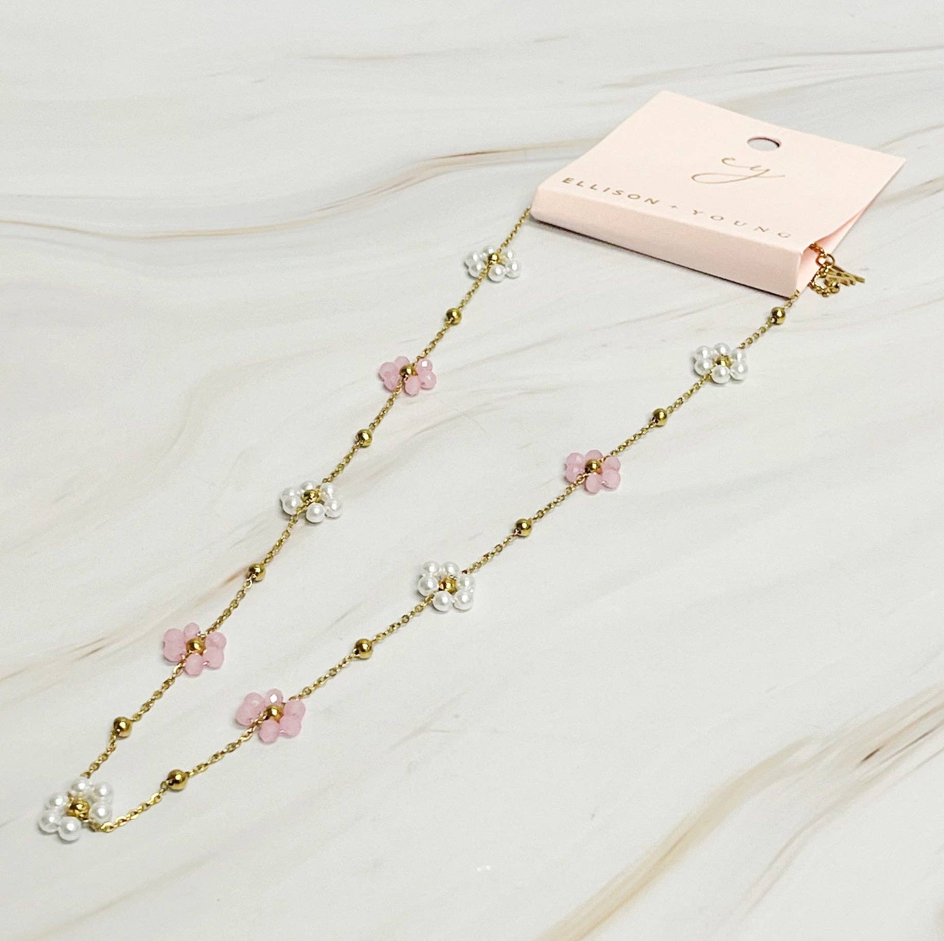 This delicate necklace features glass and pearl bead flowers, adding a touch of elegance to any outfit. The dainty chain completes the look, making it perfect for both formal occasions and everyday wear.