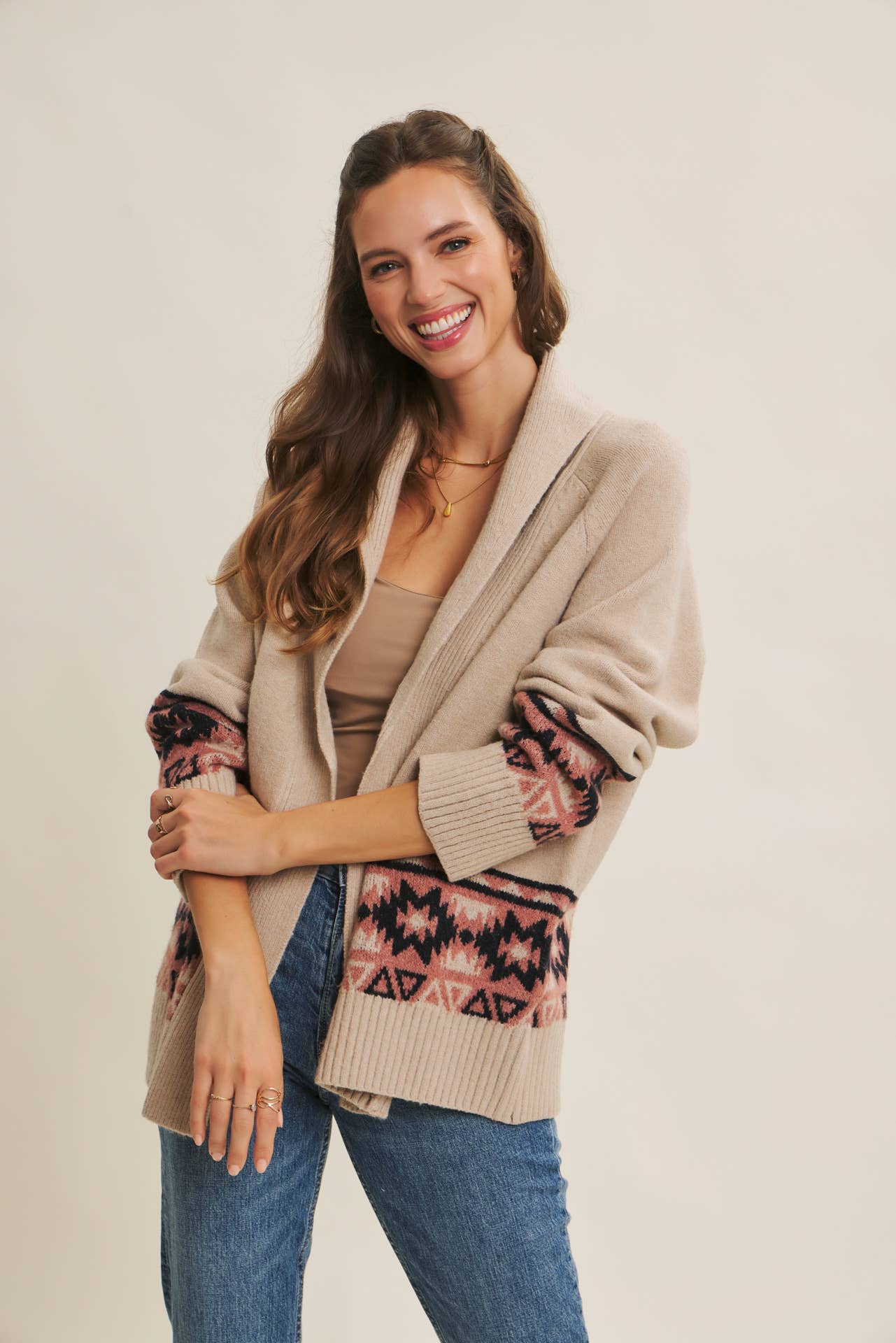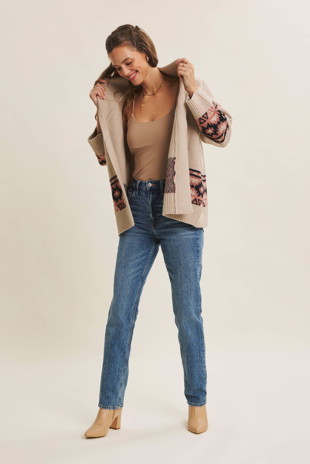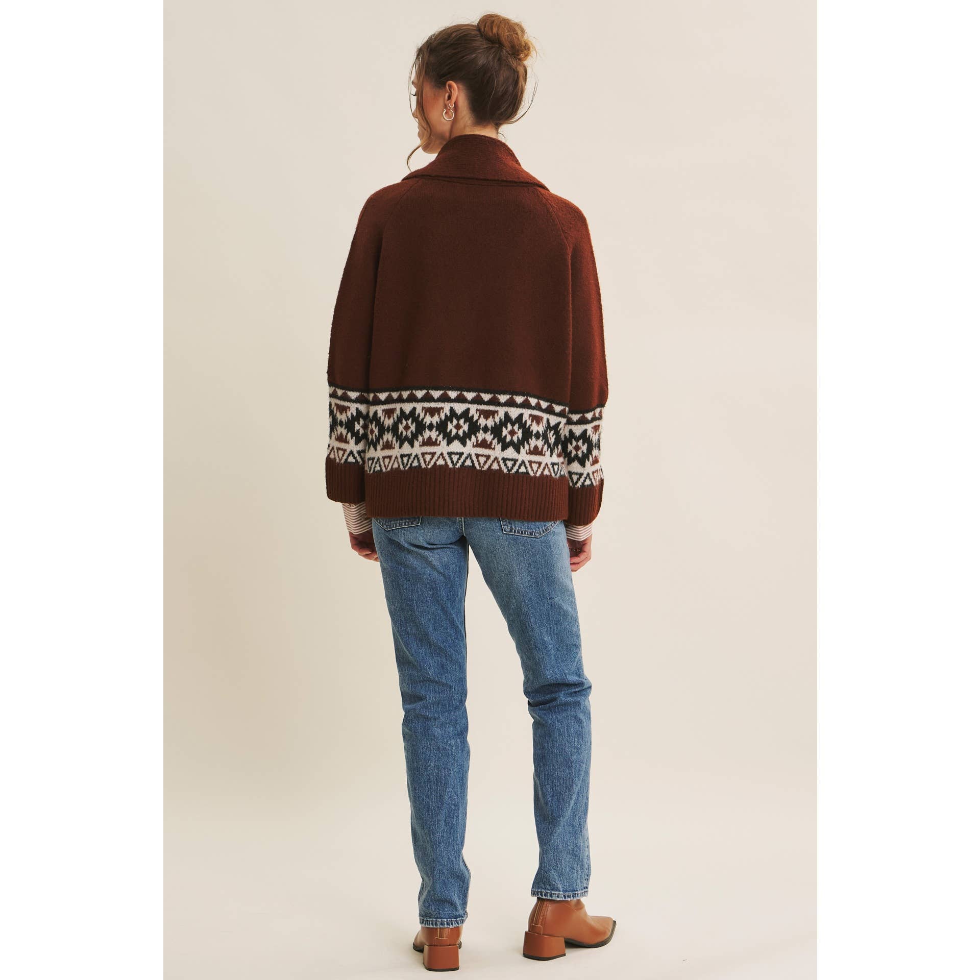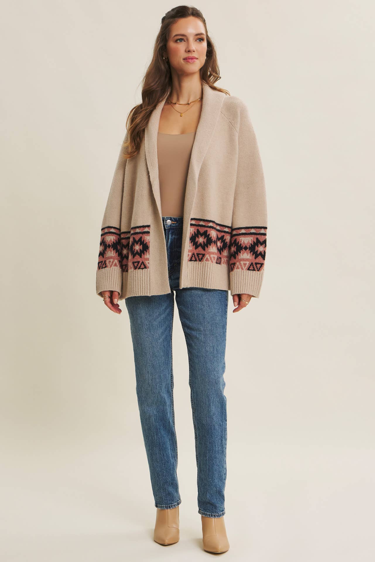 Layer into the season with this cozy cardigan that carries a touch of western charm. Designed with an oversized silhouette and open front, it’s easy to throw on over dresses, denim, or tailored pants for instant warmth and style. The collared neckline and ribbed trims lend a structured balance, while the Aztec-inspired knit design adds a timeless western flair. Its soft, cozy texture makes it perfect for chilly mornings, weekend getaways, or casual layering all fall and winter long. A true classic with versatility. This cardigan is the piece you’ll reach for again and again. Perfect for boutiques seeking effortless transitional layering styles that combine comfort with trend-right details.